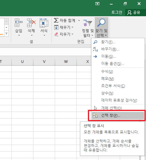 첫 번째 방법과 마찬가지로 홈 > 찾기 및 선택 > 선택 창 메뉴를 선택합니다.