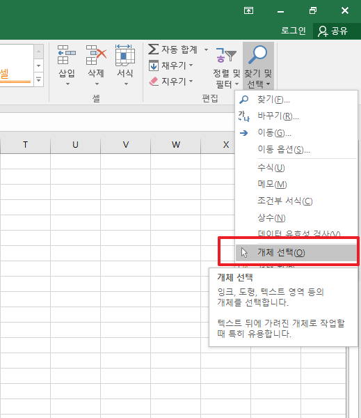 홈 메뉴의 맨 오른쪽에 있는 찾기 및 선택메뉴에서 개체 선택메뉴를 선택해줍니다.